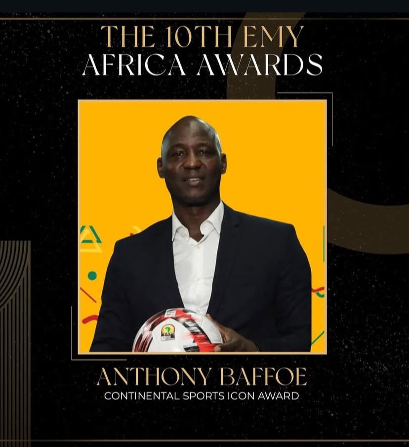 The Professional Footballers Association of Ghana (PFAG) proudly celebrates its General Secretary, Anthony Baffoe, who has been honored with the prestigious Continental Icon Award at the 10th EMY Africa Awards. The ceremony, which recognizes outstanding individuals whose work inspires and impacts the continent, highlighted Baffoe’s exceptional contribution to football both on and off the field.